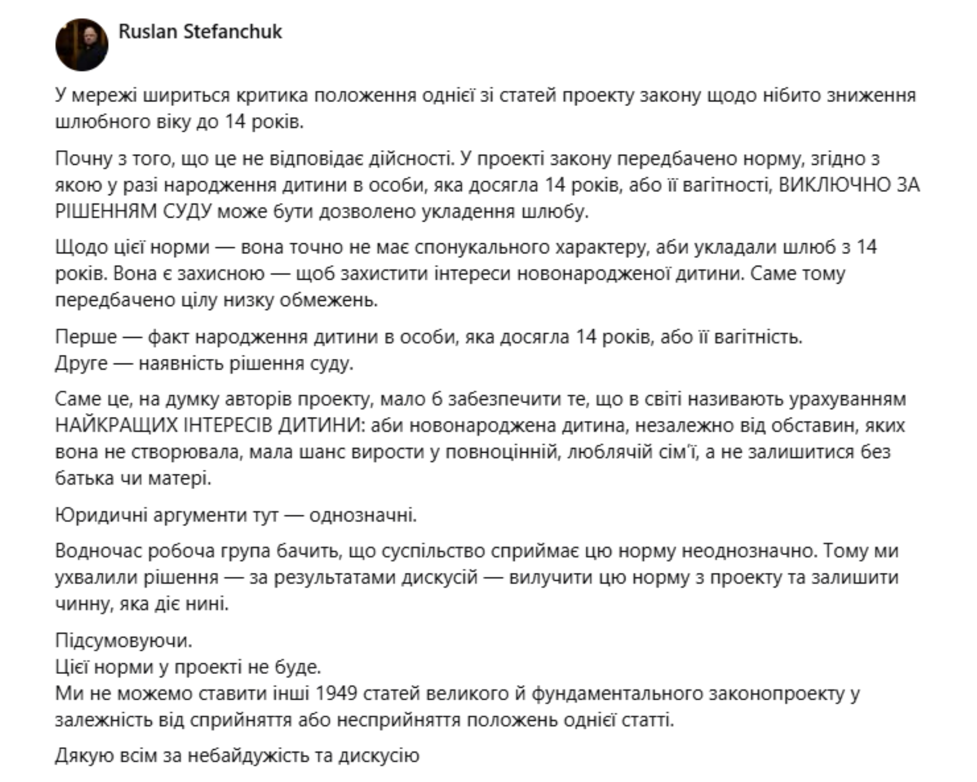 Після хвилі суспільної критики голова Верховної Ради Руслан Стефанчук публічно пояснив, що норма про шлюб із 14 років у разі вагітності або народження дитини, за задумом авторів, мала «захисний» характер — нібито для врахування найкращих інтересів новонародженої дитини, щоб вона мала шанс вирости у повній сім’ї. Водночас він визнав, що суспільство сприймає таке формулювання неоднозначно.