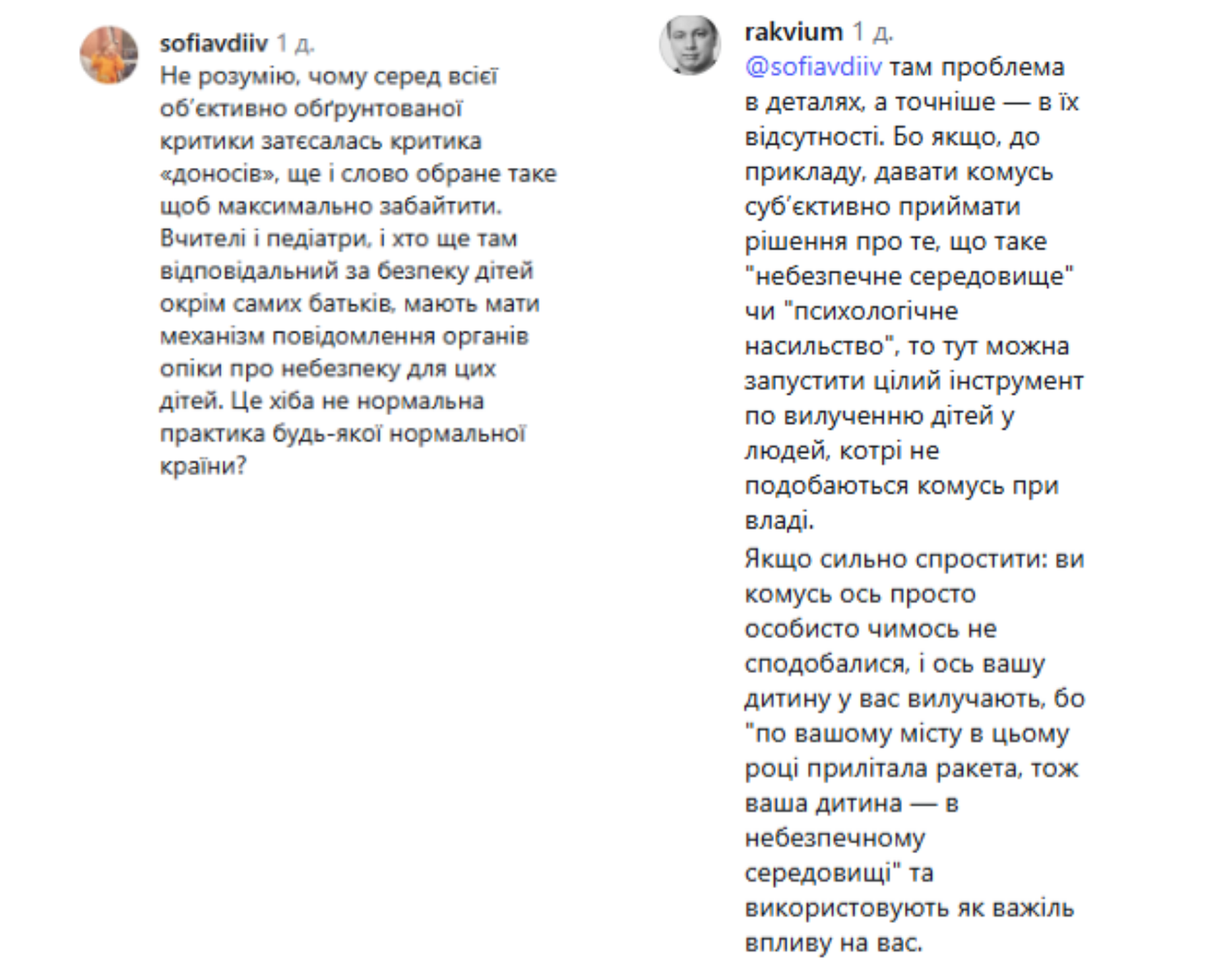 На іншому боці — занепокоєння через відсутність деталей і чітких критеріїв. Користувачі прямо пишуть, що розмиті формулювання на кшталт «небезпечне середовище» чи «насильство» можуть перетворитися на інструмент тиску: якщо рішення залишити суто на суб’єктивний розсуд чиновників або системи, завжди є ризик, що норму використають для вибіркового вилучення дітей або як важіль впливу на «незручних» батьків.