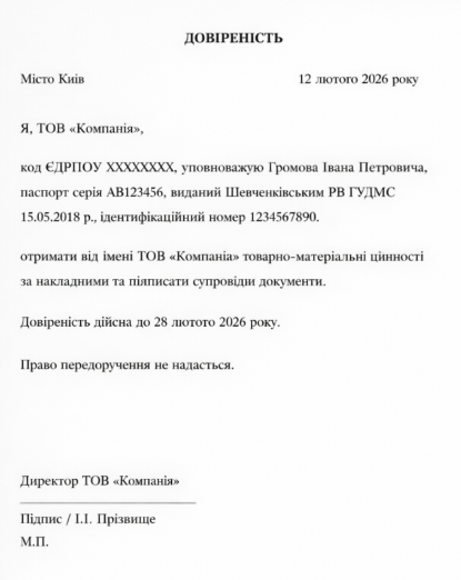 Довіреність на отримання товару: зразок для юрособи, ФОП і фізичної особи